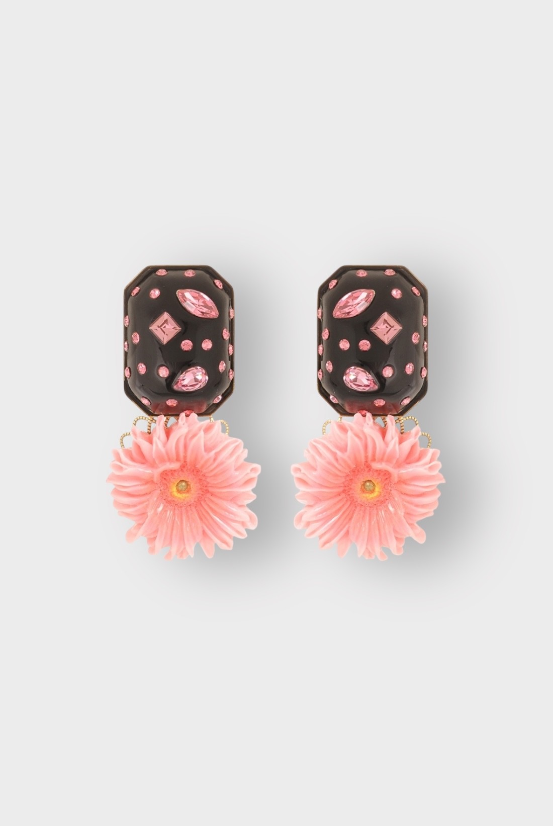 Boucles d'oreilles pendantes. La fleur est mobile sous le cabochon en résine strassée. Disponibles pour oreilles percées ou à clip.