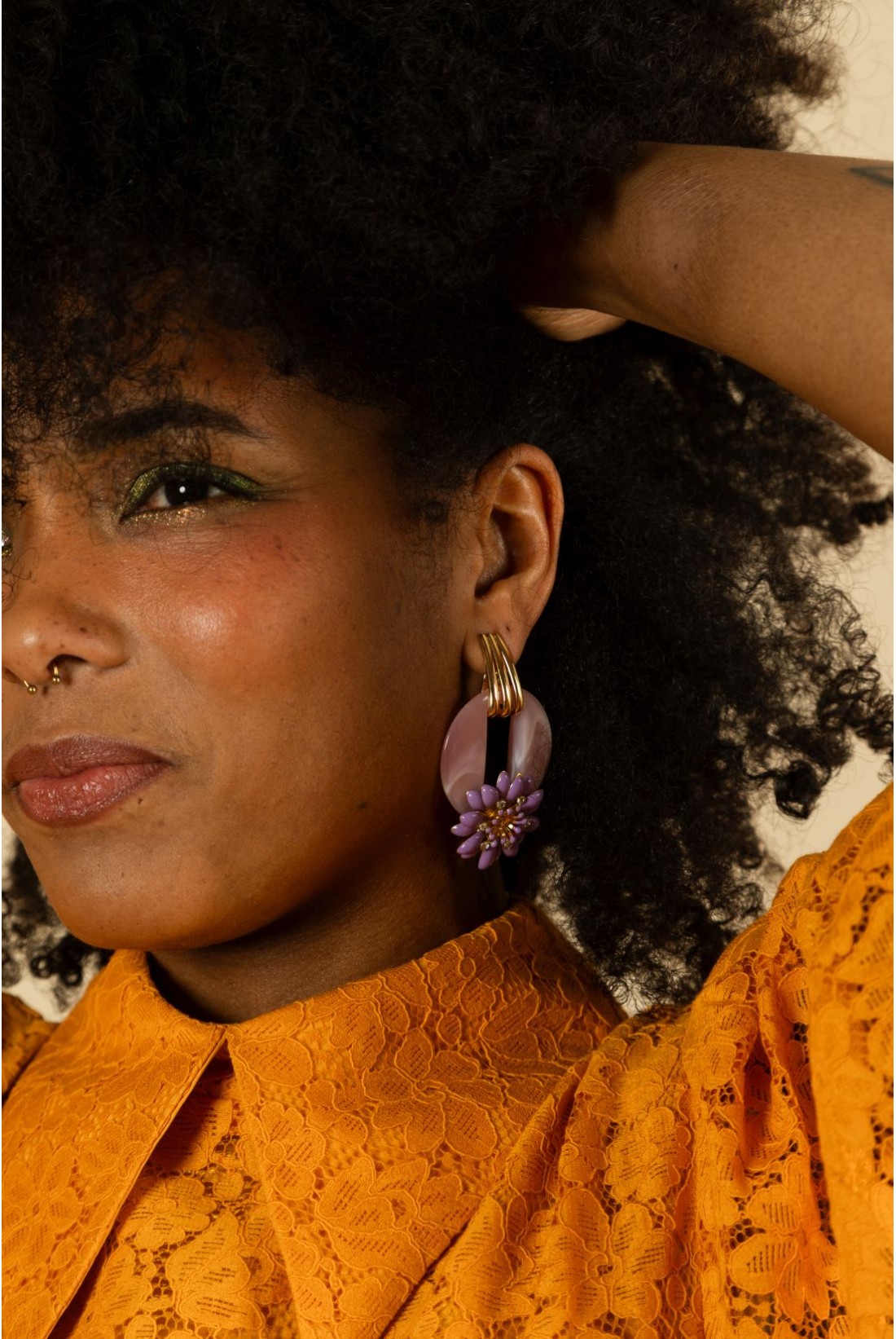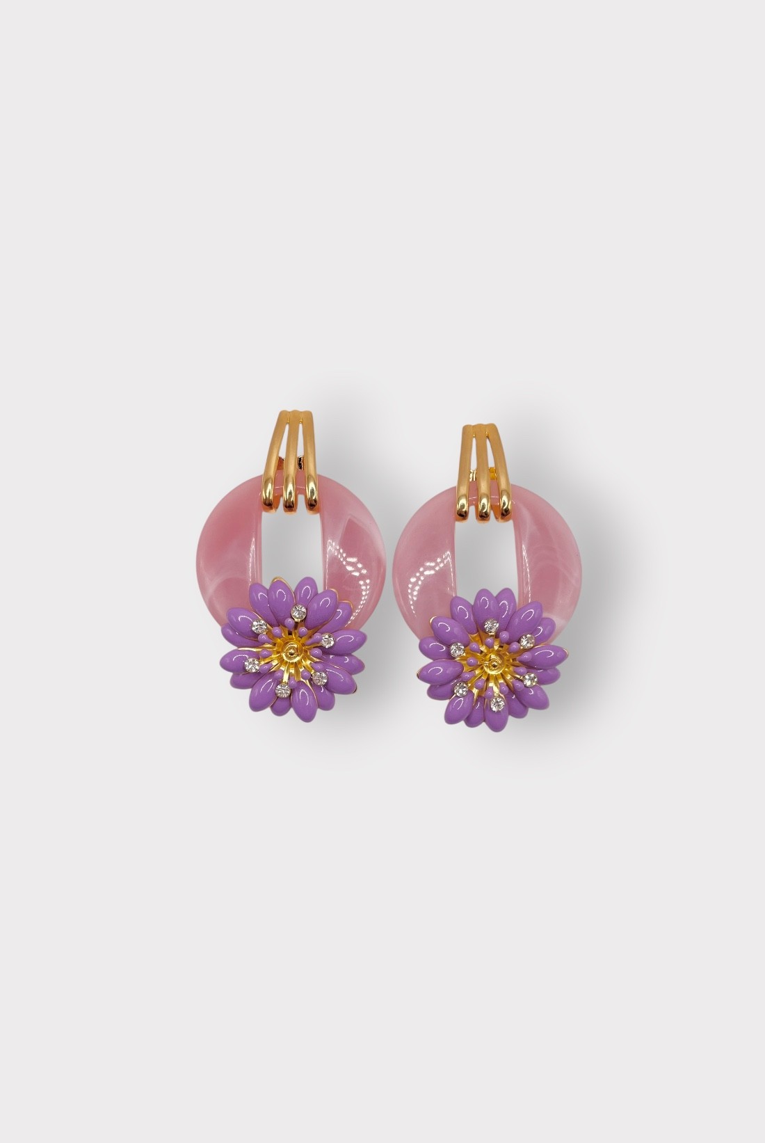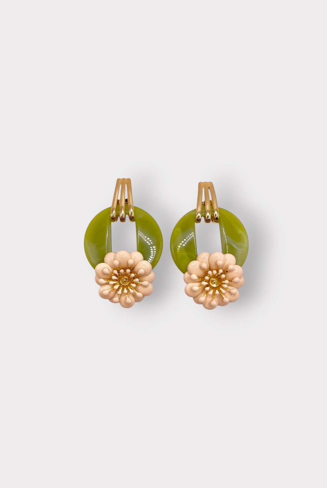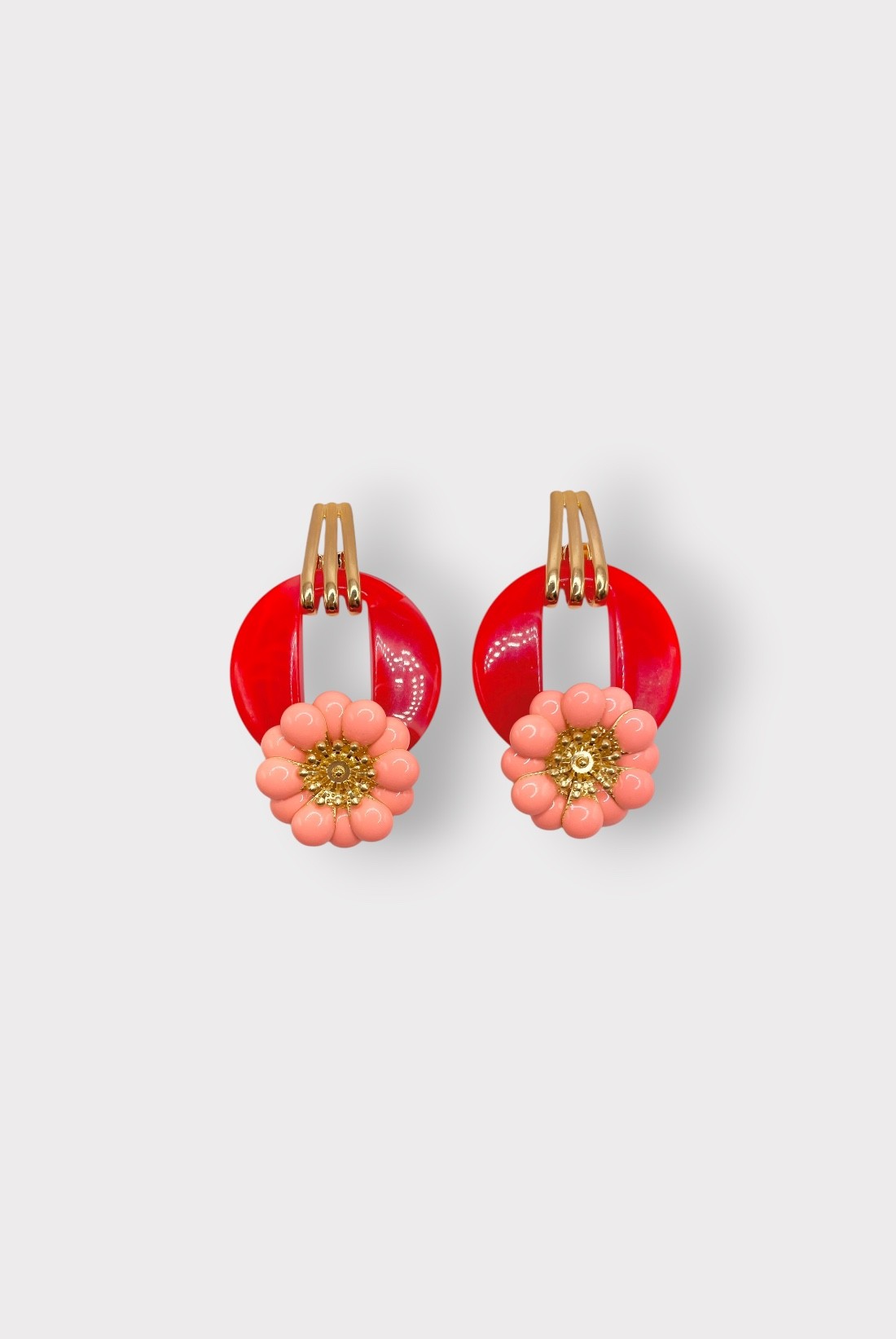 Un anneau ajouré retenu par trois attaches graphiques, une fleur perlée qui éclot au bas : ces boucles d’oreilles femmejouent la silhouette en mouvement, entre design moderne et poésie végétale. Montées à la main en France, elles signent un bijou fantaisie original, parfait pour celles qui aiment les pièces à la fois douces et affirmées — de vraies boucles d’oreilles pendantes à l’allure couture.